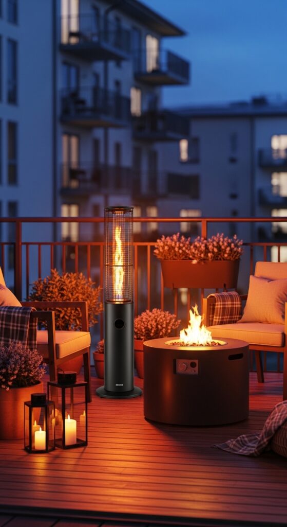 Here’s the thing: no amount of blankets will keep you outside on a truly cold night without some actual heat source. A patio heater or fire pit table is a total game-changer for extending your winter balcony season by weeks — maybe even months!