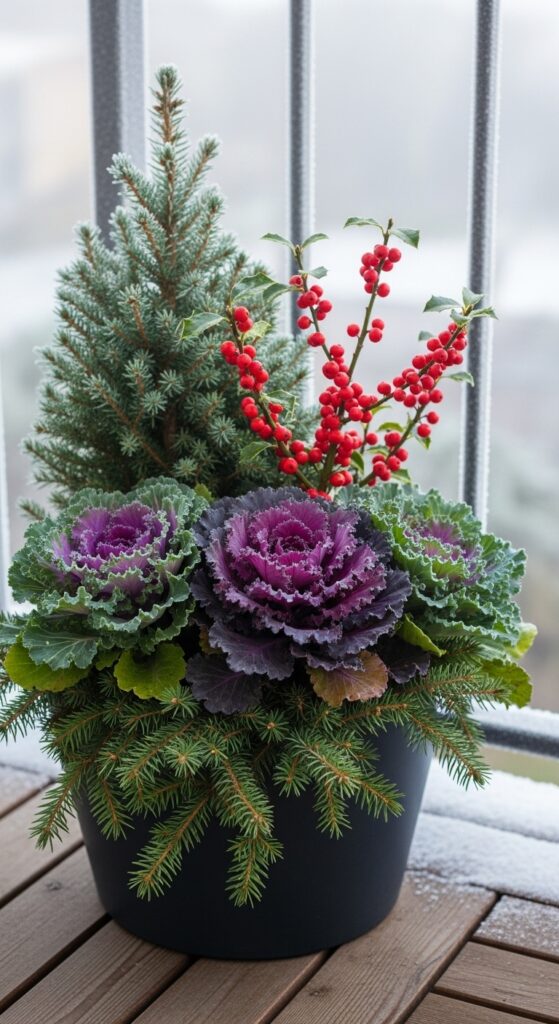 Think dwarf conifers like blue spruce or compact junipers — they stay green all winter, handle frost like champs, and look stunning in simple terracotta or matte black pots. Add ornamental kale for dramatic pops of purple and burgundy, and winterberry holly for those iconic red berries against snowy backdrops.