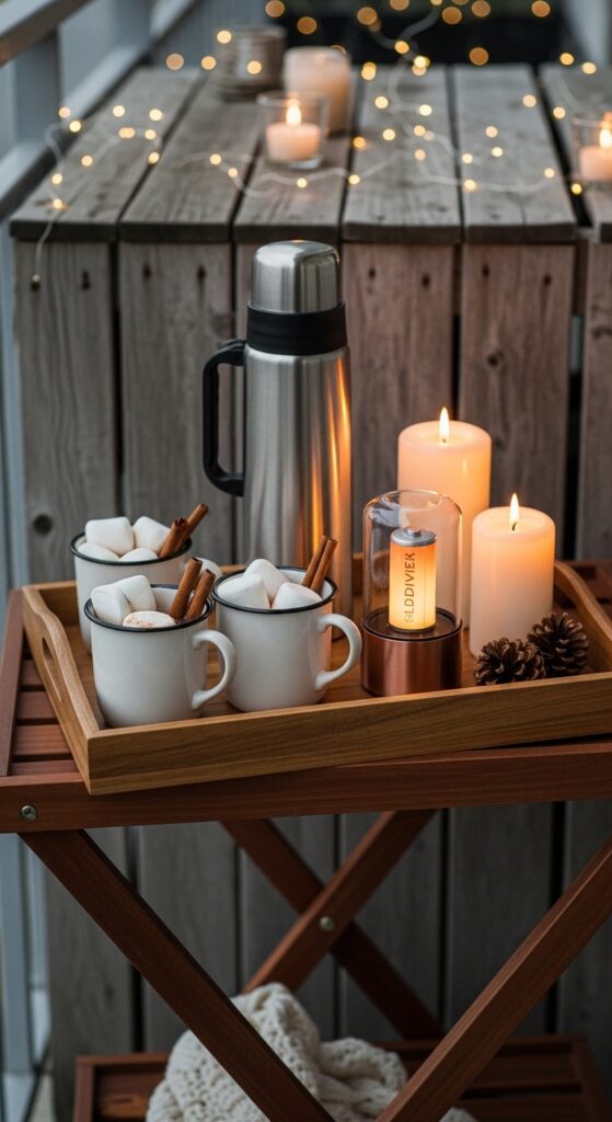 This idea is so simple and SO effective — setting up a dedicated hot drink station on your balcony gives you a reason to go out there every single day, even in winter. It’s the little ritual that makes your outdoor space feel intentional and special!