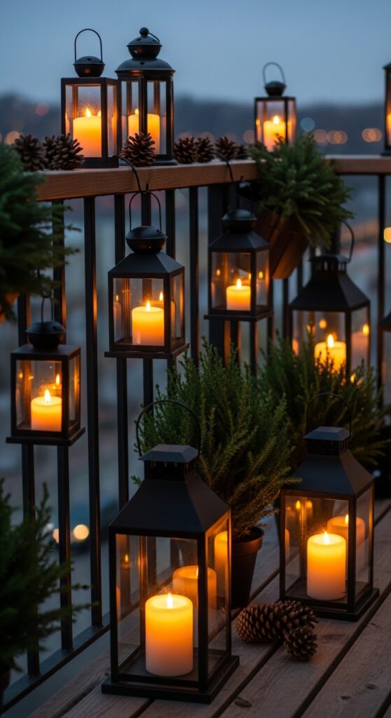 Lanterns are having a major moment in outdoor decor, and for good reason — they add layers of warm, flickering light that string lights simply can’t replicate. Hanging a few lanterns along your balcony railing creates depth, drama, and that magical candlelit warmth we all crave in winter!