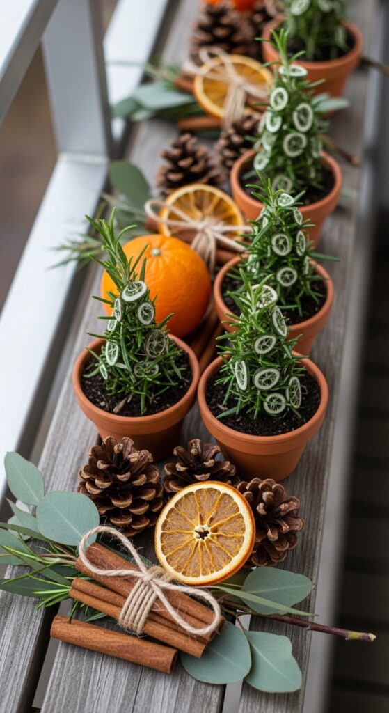 Outdoor-safe pillar candles in scents like cedarwood, clove, cinnamon, or pine are absolutely perfect for balconies. Place them in hurricane vases to protect the flame from wind. Potted rosemary, lavender, and thyme also release beautiful natural fragrance when you brush past them — nature’s own aromatherapy!