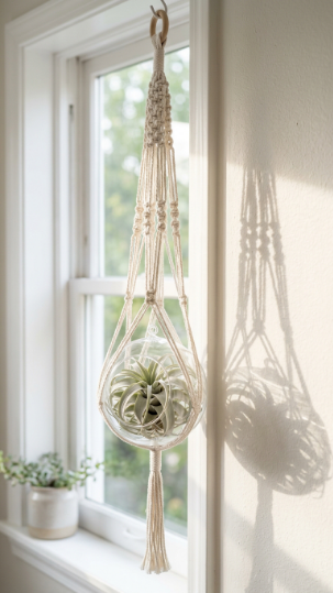 Air plants in glass globes create the most minimal and architectural of all window macramé displays — no soil, no pot drainage, no mess, and a striking geometric contrast between the glass and the knotted cotton.