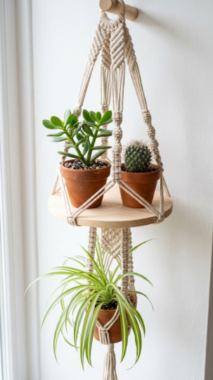 A macramé hanger with a built-in wooden disc shelf houses multiple small plants in a single hanging piece — a surprisingly space-efficient design that suits crowded south-facing windows beautifully.