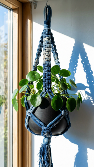 Upcycled denim macramé hangers are among the most graphic and contemporary-looking of all window plant hanger designs — and they consume fabric that would otherwise be sent to landfill.