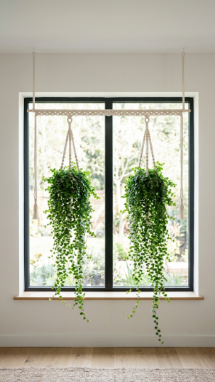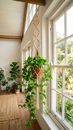 Place a large pot — 16–18cm — at the base to provide visual weight proportional to the hanger’s length. Choose a trailing plant with long cascading stems: Epipremnum aureum vines reaching 40–50cm below the pot base create a genuinely dramatic effect, with the hanging pot becoming the mid-point of a living vertical composition rather than the terminal end.