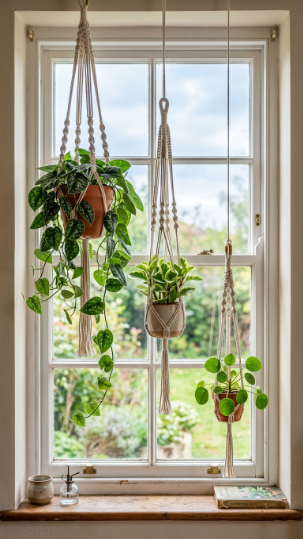 - Hanging three macramé planters at staggered heights in a single window creates a layered green display that reads as far more complex and designed than its actual making time suggests.