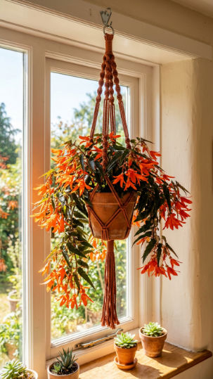 Begonia boliviensis ‘Bonfire’ (cascading orange tubular flowers, summer through autumn) and Fuchsia trailing varieties are both outstanding candidates for a south or west-facing window hanger in summer. Both produce flowers on cascading stems that use the hanger’s height to full dramatic effect — a standard pot on a shelf could never display the same downward cascade.