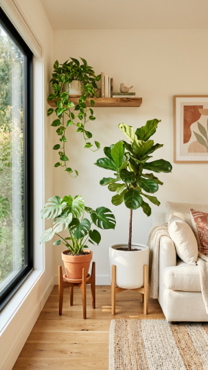 The secret is thinking in layers of height rather than placing a single plant. A tall floor plant (your drama piece — Fiddle Leaf Fig, Bird of Paradise, large Monstera, or Rubber Plant) anchors the corner at ceiling height. A medium plant on a wooden plant stand beside it fills the mid-level. A trailing plant on a shelf above adds the overhead element that makes the whole composition feel genuinely lush and designed.