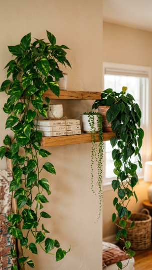 Trailing plants on shelves are the indoor garden idea that looks the most effortlessly stylish with the least intervention — because the plants themselves do most of the work, growing longer and more beautiful every week while you simply enjoy the results.