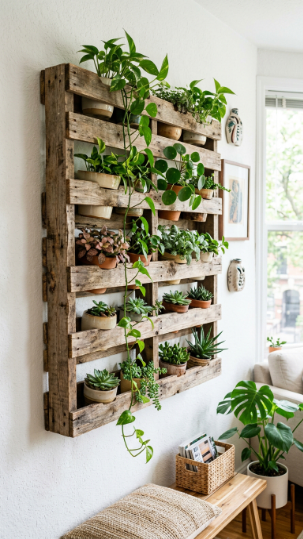 The simplest version is a reclaimed pallet mounted on the wall with small pots nestled between the slats — achievable in an afternoon with a few wall fixings and completely free if you can source a pallet from a local supplier. The result looks like a deliberately designed living wall installation because, essentially, it is.