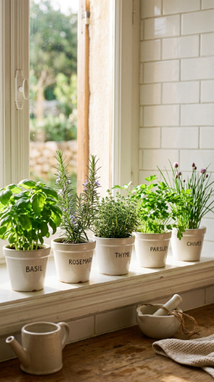 The kitchen herb window formula: uniform white or terracotta pots (matching vessels create instant cohesion), your most-used herbs arranged by height (tallest at the back — rosemary, sage; medium in the middle — basil, flat-leaf parsley; smallest at the front — thyme, chives), and a simple drip tray or moisture mat beneath to protect the windowsill and simplify watering.