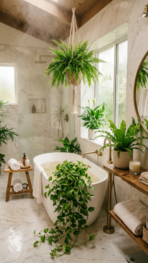 Transform your bathroom into a private tropical spa with the right plants — it costs almost nothing and the daily experience of bathing surrounded by lush greenery is genuinely extraordinary!
