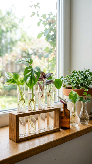 The visual magic of a propagation station is the clarity of the glass vessels and the visible root development — watching white roots thread down through clear water over 2–3 weeks is genuinely captivating, and the backlit effect of a propagation station on a bright windowsill (glass vessels, green cuttings, white roots, bright light) is one of the most beautiful things in any plant-filled home.