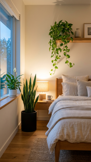 The ideal bedroom plant trio: one tall, architectural plant beside the bed or in a corner (Snake Plant for its striking upright form and extreme low-maintenance, or a slim Dracaena for softer elegance). One small, flowering plant on the windowsill (Peace Lily for its gentle white spathes and air-purifying reputation, or a compact Anthurium for longer-lasting color). One trailing plant on the headboard shelf or bedside shelf above the bed (Pothos or Heartleaf Philodendron, growing long and softening the space above where you sleep).