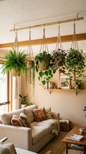 The impact is completely disproportionate to the installation effort: a single ceiling-mounted rod or copper pipe with five plants hanging at varied heights creates a living canopy above your seating area that makes the room feel like it’s been completely transformed — as if a professional interior stylist spent a week on it rather than you spending an afternoon.
