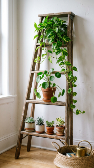 Vintage wooden ladder: leaned against a wall, each rung holds plants at a different height — creates the perfect tiered plant display in a narrow footprint ideal for small apartments.