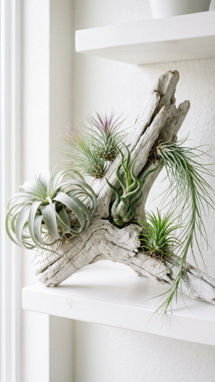 The driftwood display is the most beautiful air plant mounting approach — the pale, sculptural quality of driftwood complements the silvery, otherworldly quality of many Tillandsia species perfectly, and the combination of white-grey driftwood against a white wall creates a display with a quality of minimalist gallery art.