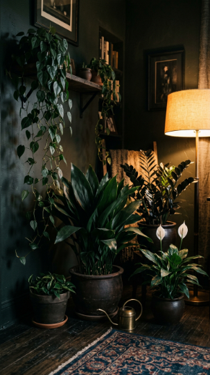 The shade-tolerant plant collection creates a moody, dramatic, deeply atmospheric indoor garden that’s actually impossible to achieve with light-loving plants — the rich, deep greens and near-black foliage of the best shade plants, lit by warm lamp light in a dark room, create an interior aesthetic of extraordinary sophistication.