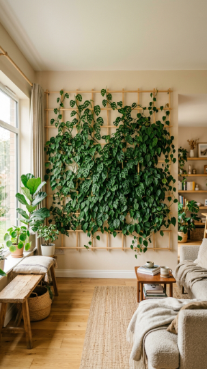 A DIY indoor trellis climbing plant wall is the indoor garden project that creates the most genuinely architectural, gallery-quality result from the simplest construction — a grid of bamboo canes or timber dowels fixed to the wall creates a framework that climbing and vining plants fill over a single growing season into a complete living wall installation.