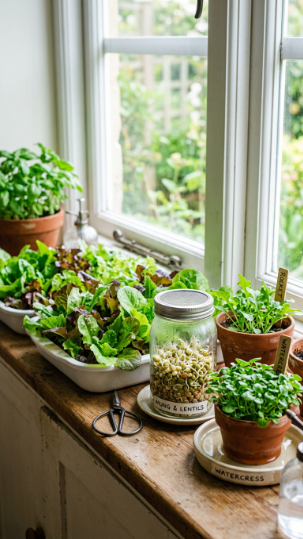 A windowsill salad and sprout garden is the most productive indoor food garden per square centimeter possible — producing genuinely fresh, genuinely nutritious, genuinely homegrown food on a windowsill that might be only 15cm deep and 60cm wide, year-round, for the cost of seeds and a little compost.