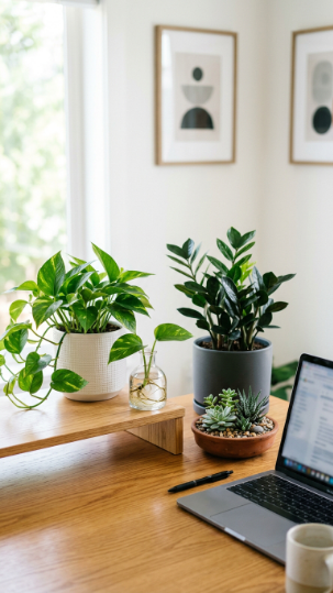 The ideal home office desk plant collection: a small Golden Pothos (trails elegantly from a desk riser without taking over), a compact ZZ Plant (handles the low light and irregular watering of a home office environment better than almost anything), a succulent or cactus in a beautiful small pot (needs almost no attention, adds living texture, and never outgrows its space quickly), and a single propagation vessel with a cutting in water (beautiful to look at, fascinating to observe, completely mess-free).