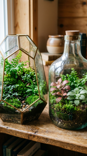 Geometric glass terrariums (available widely) create a more contemporary, architectural aesthetic than traditional round glass. Large glass bottles create a more traditional Wardian case-style bottle garden — planting through the bottle neck with long-handled tools is the satisfying challenge of this format.