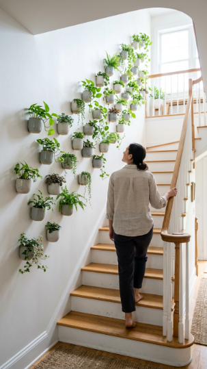💡 Pro Tip: Use battery-operated LED strip lights mounted beneath your staircase shelf or above your wall-mounted planters — the plants are lit from below or above rather than relying on the typically poor staircase and hallway natural light, they look spectacular after dark as illuminated botanical installations, and the light genuinely helps maintain plant health in what are often the lowest-light spaces in any home.