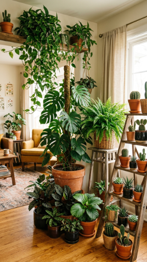 Building the jungle corner: start with one tall anchor plant (minimum 120cm) — without a visual anchor, dense planting becomes chaos; with one, it becomes a curated jungle. Build upward with climbing plants on moss poles (Monstera, Philodendron). Fill outward with mid-height plants on stands and floor-level plants in large pots. Add hanging plants from ceiling hooks above the corner. Finish with small plants tucked into every remaining space.
