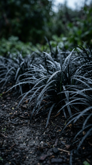 The textural contrast between black mondo grass and silvery-leafed plants like artemisia or lamb’s ears beside it creates a light-versus-dark tension that’s incredibly compelling in a witchy garden setting.