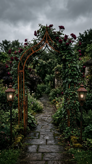 A rusted iron arch at the entrance to a garden section, draped with dark climbing roses or Clematis ‘Romantika’ (near-black flowers), creates a threshold moment — a deliberate passage from ordinary garden to magical space — that’s both practical and powerfully symbolic.