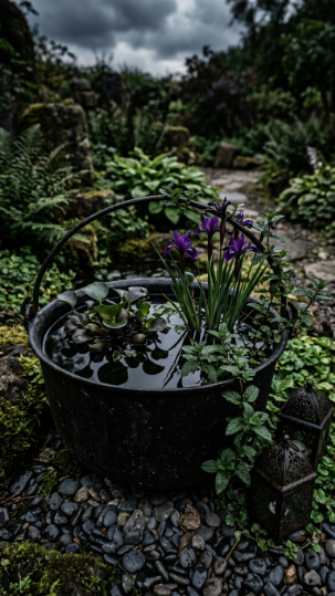🌿 Pro Tip: Add a few drops of liquid pond dye in dark blue or black to the cauldron water — it creates a beautifully mysterious dark reflective surface while being completely safe for plants and wildlife, and prevents algae from greening the water in warm weather.