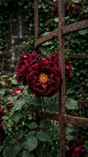 A dark climbing rose over an iron arch is gothic garden perfection — plant one and wait for the magic!
