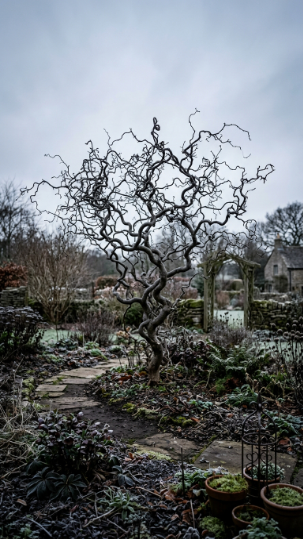 Here’s the thing: the winter silhouette of a contorted tree against a grey January sky is one of the most genuinely witchy garden moments any plant can create — it looks alive in a way that upsets the usual visual expectations of a garden.