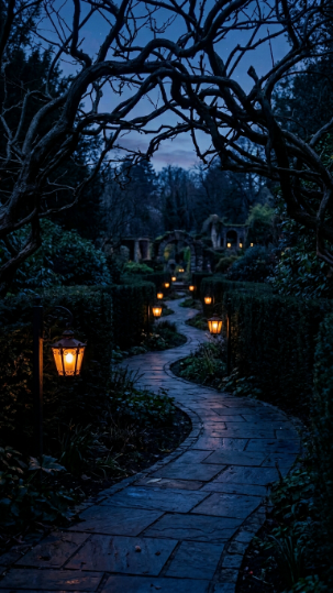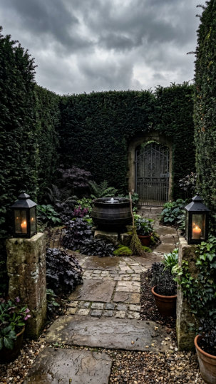 Place iron lanterns at irregular intervals along the path — not evenly spaced, but clustered where the atmosphere requires focus and absent in darker stretches that need mystery. Lead the path to a destination — your cauldron water feature, a stone bench, the entrance to your hedge-enclosed garden room — that rewards the journey completely.