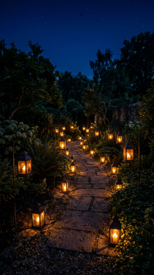 Line a winding garden path with lanterns at varying heights — some directly on the ground, some on low iron pillars, some hung from tree branches — for a lighting scheme that creates depth, mystery, and a sense of a pathway leading toward something unknown.