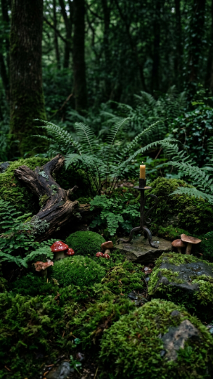 A dark moss and fern woodland corner creates the most atmospherically convincing piece of genuine wildwood you can achieve in a garden — the sensation of standing in a deep, old forest where magic feels entirely plausible. Cushion moss covering the ground and rocks, dark-stemmed ferns unfurling above, a gnarled fallen log, and a single iron candle holder placed among the foliage creates a scene of profound natural beauty.