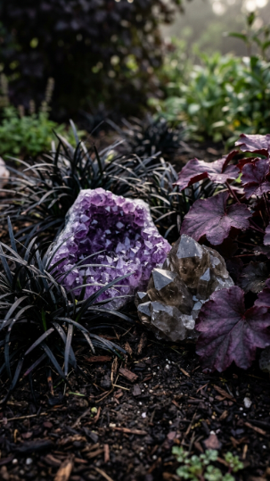 Large amethyst clusters, smoky quartz points, dark obsidian pieces, and moss agate stones placed among black mondo grass, dark heuchera, and low border plants create stunning moments of discovery as visitors move through the garden. The light-catching facets of larger crystals are especially beautiful in morning and evening light.