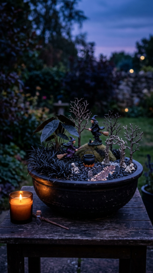 Plant a large dark container with black mondo grass as ground cover, a miniature dark-leafed plant for height, and then populate with tiny cauldron ornaments, miniature witch figurines on broomsticks, skeletal miniature trees made from twisted wire, dark pebble mulch, and tiny iron lanterns. Add a battery-operated fairy light wrapped through the skeletal trees for evening magic.