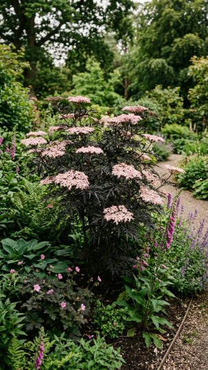 The deeply cut, near-black feathery foliage of ‘Black Lace’ looks like living black lace against a garden backdrop — extraordinarily elegant and genuinely dark — while the flat-topped pale pink flower heads in summer create a stunning light-versus-dark contrast that’s pure witchy garden gold. The black berries that follow are deeply atmospheric and wildlife-friendly.