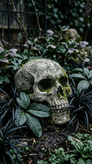 The secret to using gothic ornaments beautifully rather than garishly is naturalistic placement and weathering. A stone skull half-hidden among hellebore leaves, colonized by moss and surrounded by black mondo grass, reads as a genuine garden discovery rather than a Halloween prop. Placement, context, and patina are everything.
