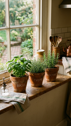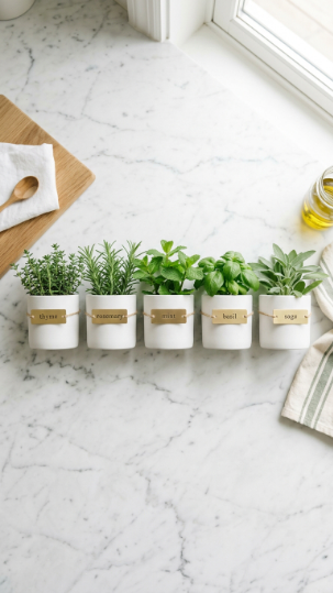 Label each pot with small brass or chalkboard tags — it looks organized and makes grabbing the right herb effortless. Sage, basil, chives, thyme, and parsley make a perfect five-herb lineup.