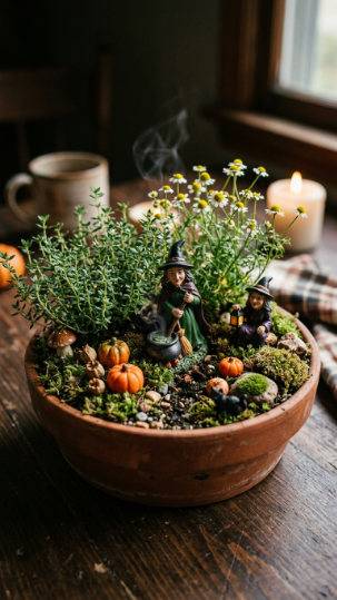 Tuck tiny figurines — witches, black cats, little cauldrons — among low-growing herbs like thyme or creeping chamomile. Add a few miniature pumpkins and some decorative moss for that full witch’s garden atmosphere.