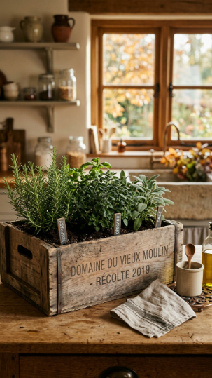 Sage, oregano, and rosemary are perfect fall herbs for this setup — they’re Mediterranean, they love well-drained soil, and they actually look gorgeous with that rustic wood aesthetic.