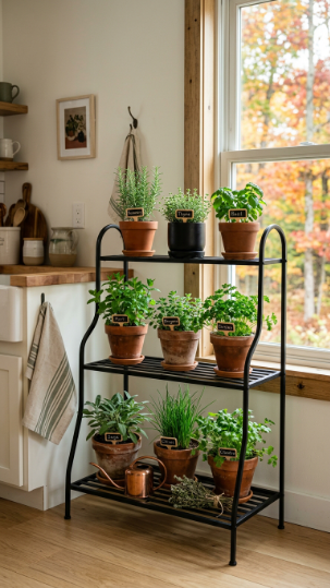 A tiered plant stand turns your fall kitchen herb garden into a proper showstopper. You get multiple levels of growing space without taking up extra floor area — genius!