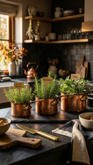 Copper planters are having a serious moment — and honestly, they deserve it. The warm metallic tones of copper pots against fall herbs like lemon thyme and rosemary look absolutely stunning in an autumn kitchen.