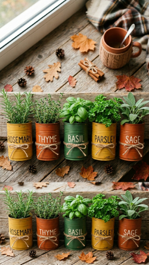 Here’s the deal: the most charming herb gardens are often the cheapest ones to make. Recycled tin cans — from soup, coffee, or tomatoes — make adorable fall kitchen herb garden containers when painted in autumnal shades.