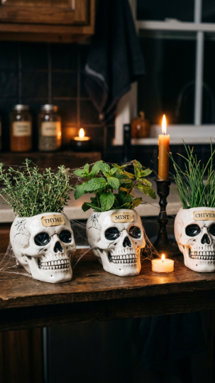 You can find ceramic skull planters at craft stores, garden centers, or online marketplaces every fall. Plant thyme in one, mint in another, and chives in a third for a coordinated spooky herb collection your whole kitchen will love.