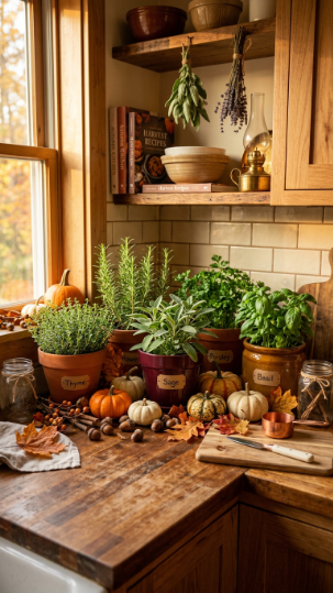 Your herbs stay completely functional — you’re just styling the staging around them. Rosemary, sage, and thyme all have lovely muted green and silver tones that pop beautifully against fall’s warm palette.