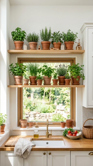 Floating shelves above or beside your kitchen window are an absolute dream for fall herb growing. You get maximum light exposure without sacrificing any precious counter space — total win!
