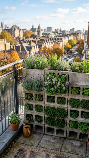 Plant lavender, oregano, and thyme — all fall-hardy herbs that actually get happier as the temperature drops a bit. The blocks retain heat during the day and release it slowly overnight, protecting roots from early frosts.
